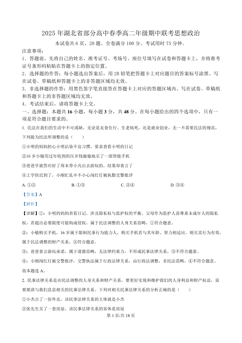 湖北省黄冈市十五校2024-2025学年下学期4月高二期中联考政治(精品解析版)