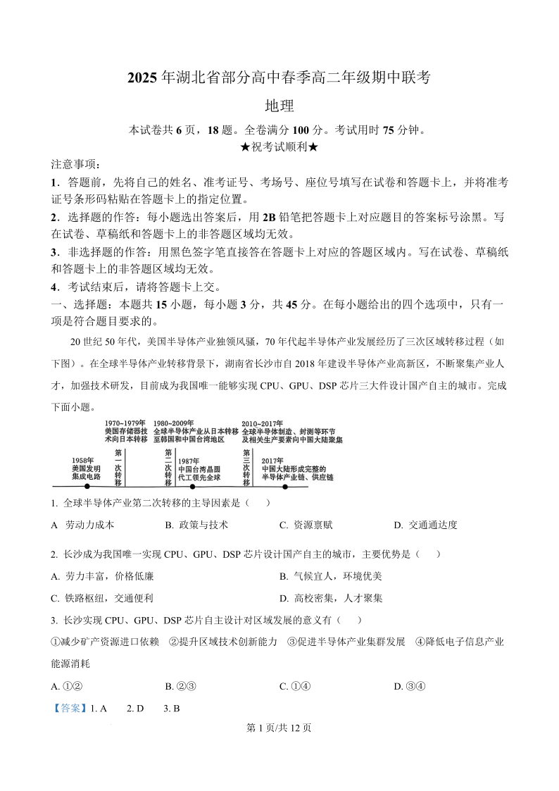 湖北省黄冈市十五校2024-2025学年下学期4月高二期中联考地理(精品解析版)