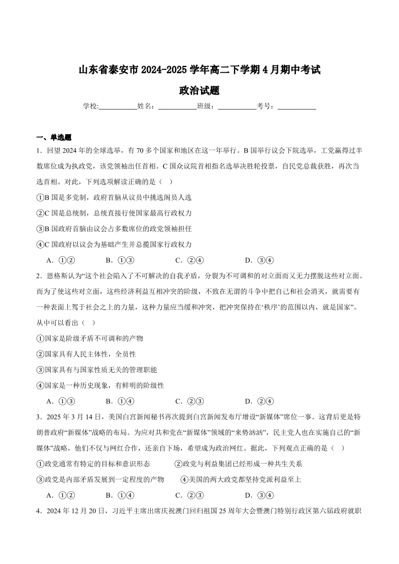 山东省泰安市2024-2025学年下学期4月高二期中考试政治+答案