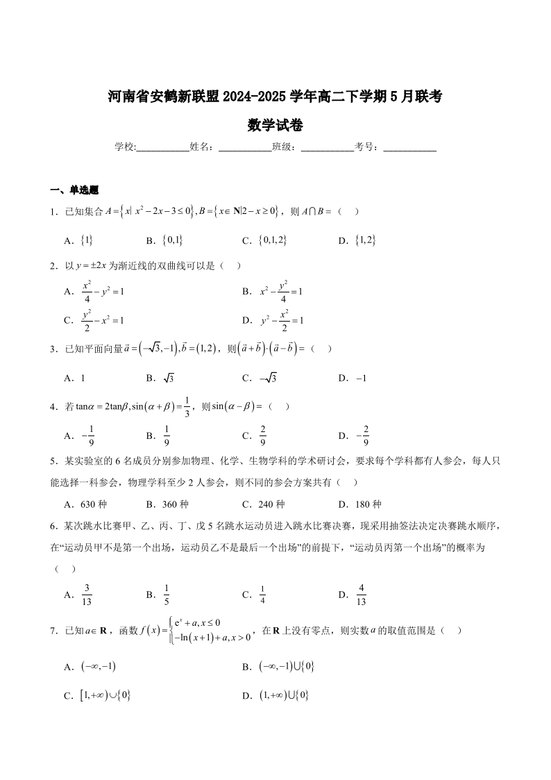 河南省安鹤新联盟2024-2025学年下学期5月高二联考数学+答案