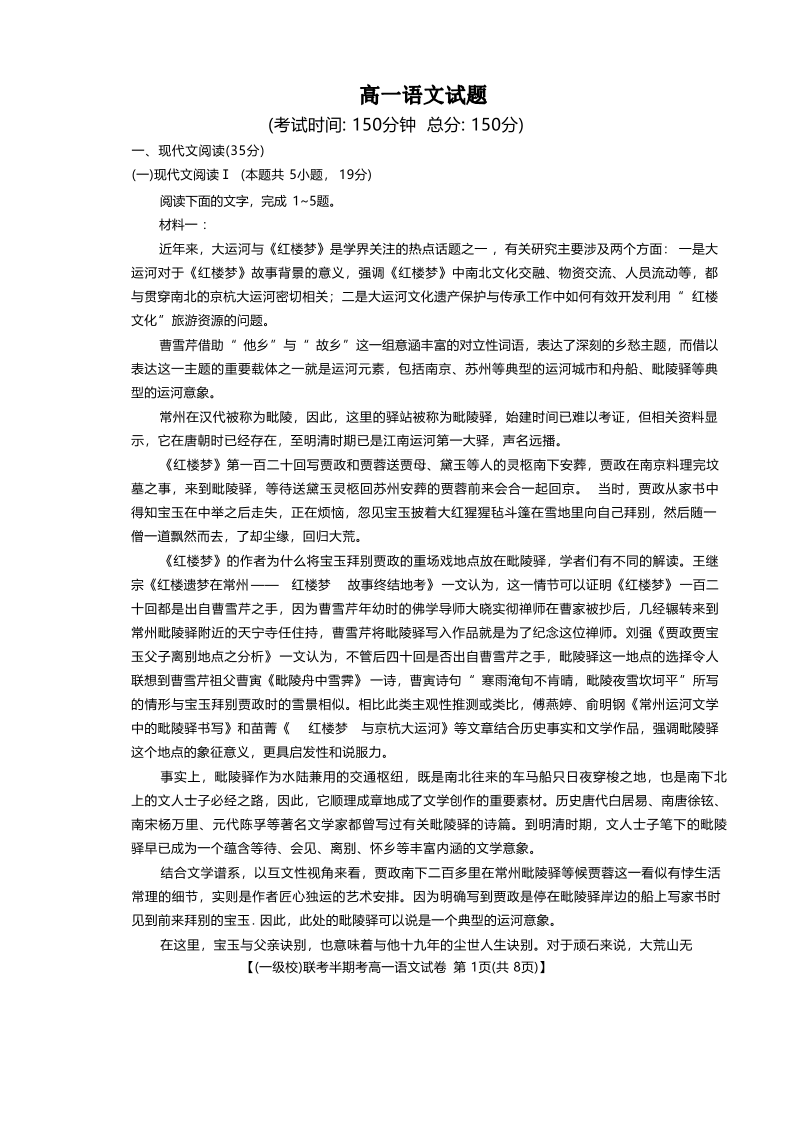 福建省龙岩市一级校联盟2024-2025学年下学期4月高一期中联考语文+答案