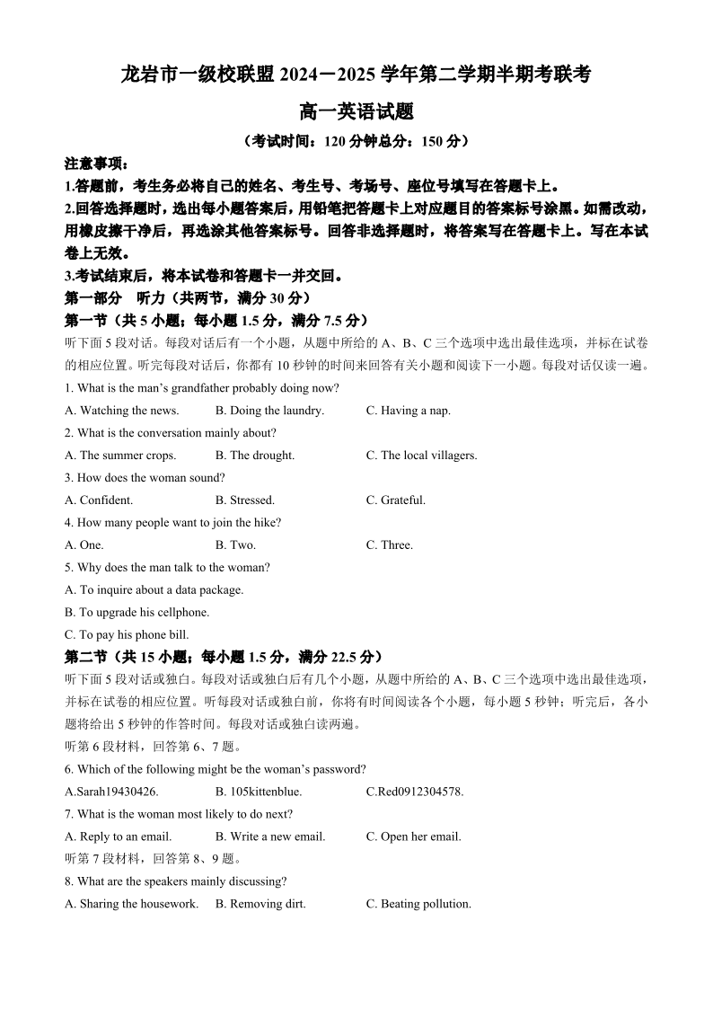福建省龙岩市一级校联盟2024-2025学年下学期4月高一期中联考英语+答案