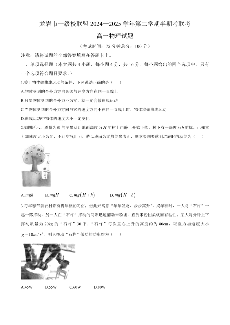 福建省龙岩市一级校联盟2024-2025学年下学期4月高一期中联考物理+答案