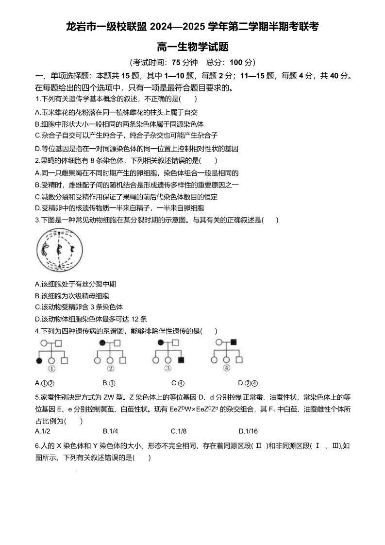 福建省龙岩市一级校联盟2024-2025学年下学期4月高一期中联考生物+答案