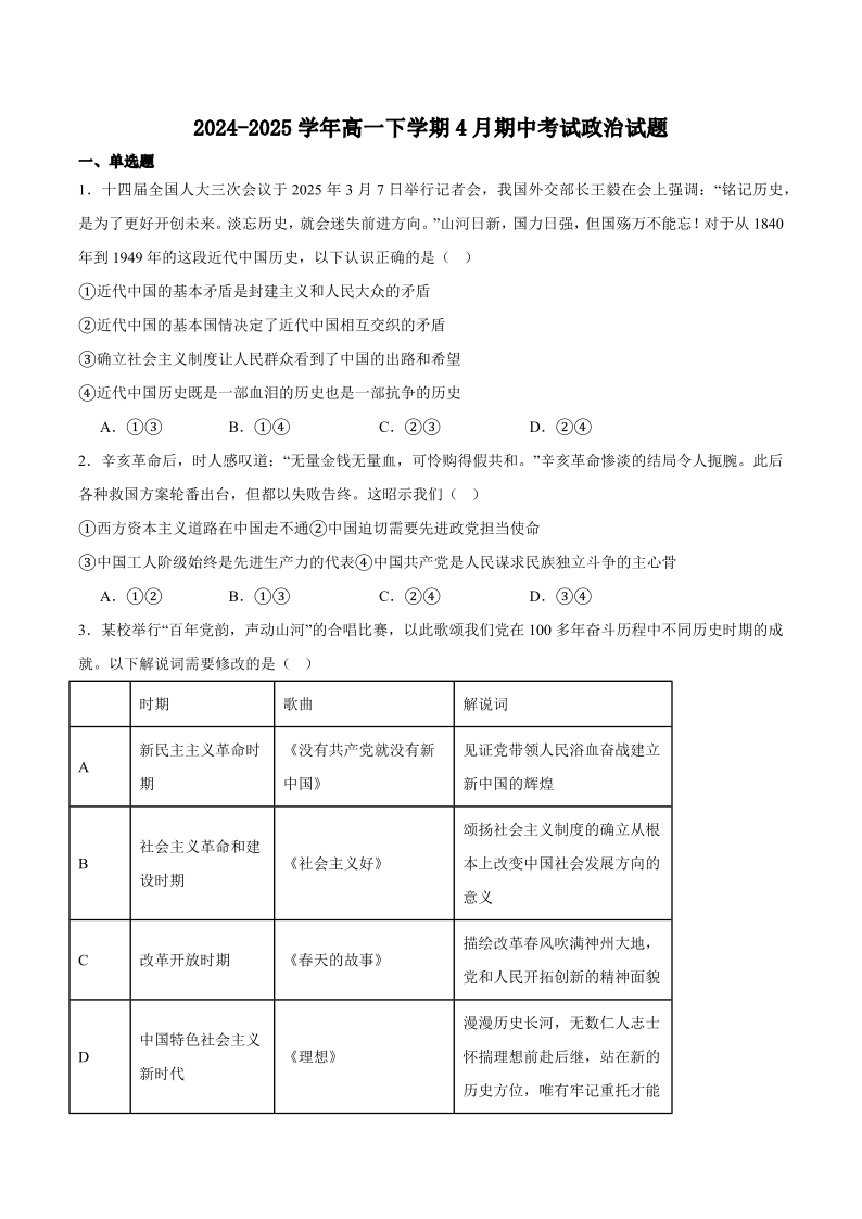 福建省龙岩市一级校联盟2024-2025学年下学期4月高一期中联考政治+答案