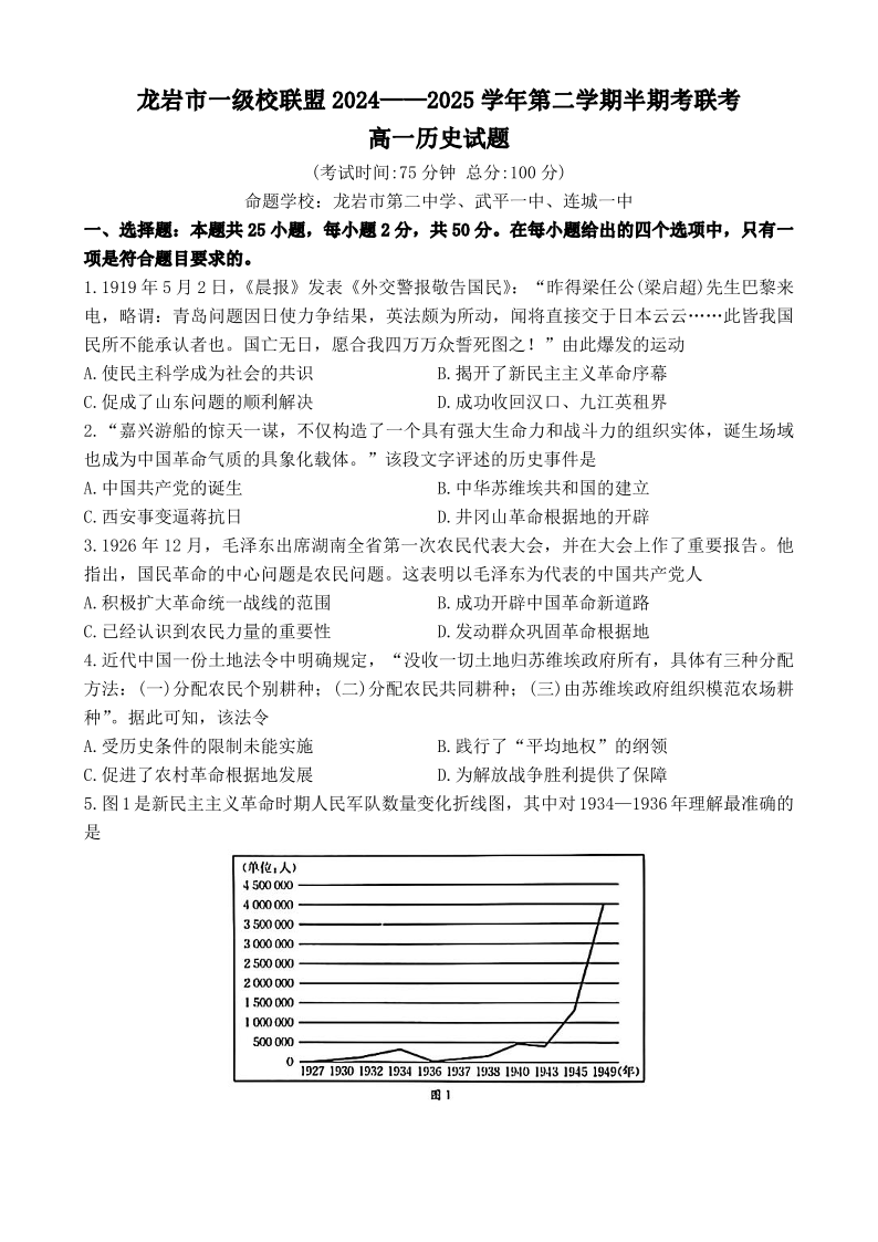 福建省龙岩市一级校联盟2024-2025学年下学期4月高一期中联考历史+答案