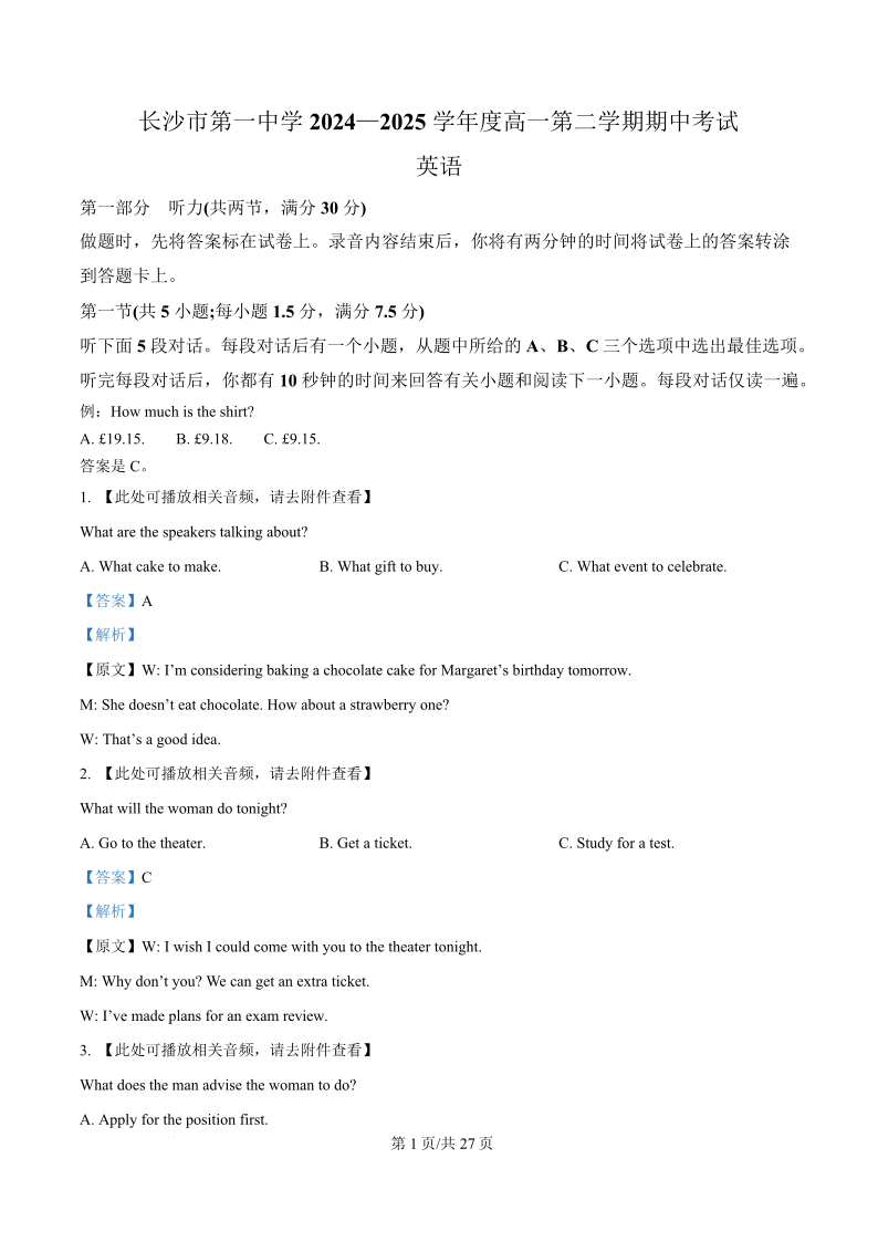 湖南省长沙一中2024-2025学年下学期高一期中考试英语(精品解析版)