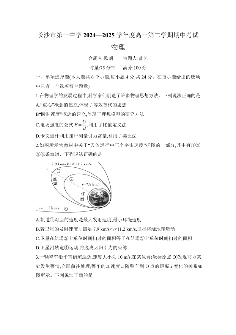 湖南省长沙一中2024-2025学年下学期高一期中考试物理