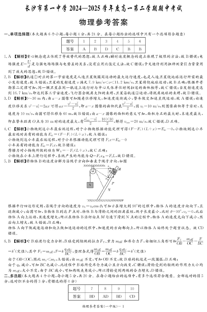 湖南省长沙一中2024-2025学年下学期高一期中考试物理答案