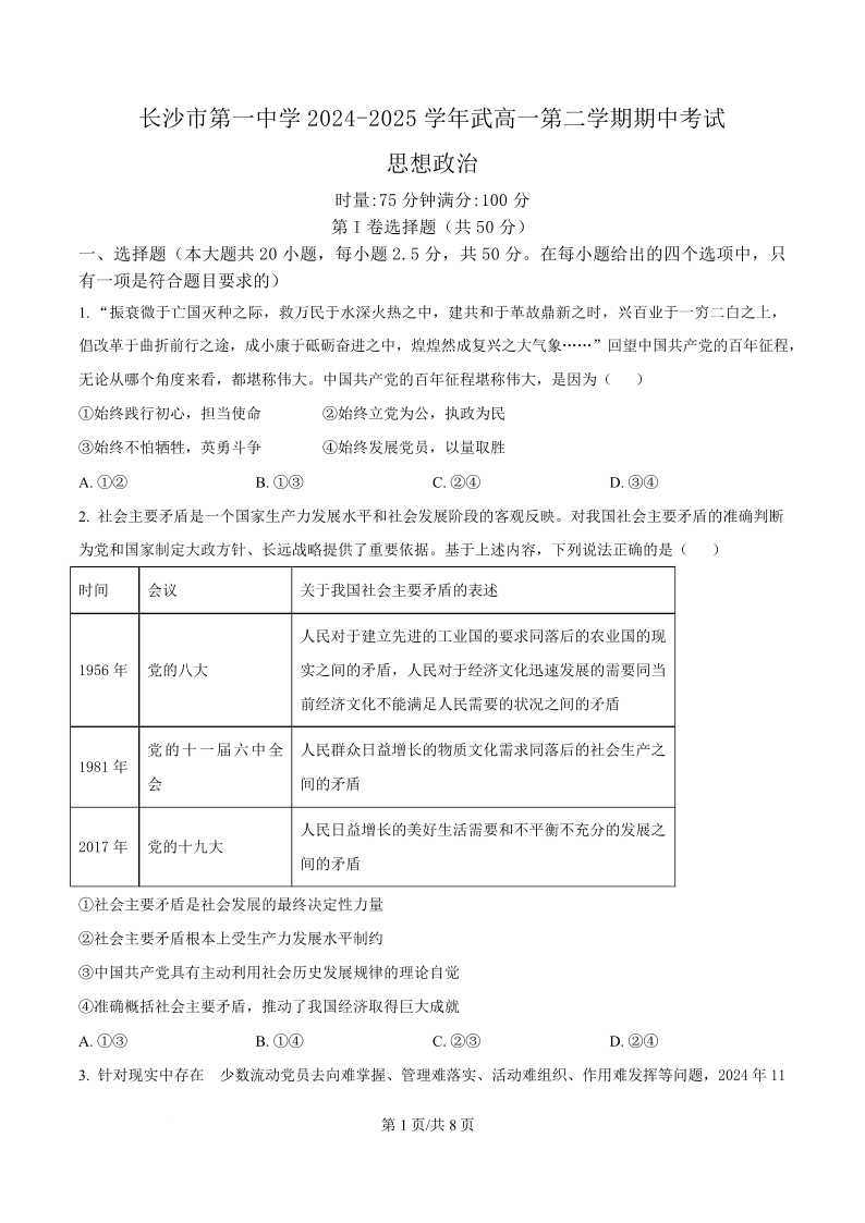 湖南省长沙一中2024-2025学年下学期高一期中考试政治(原卷版)