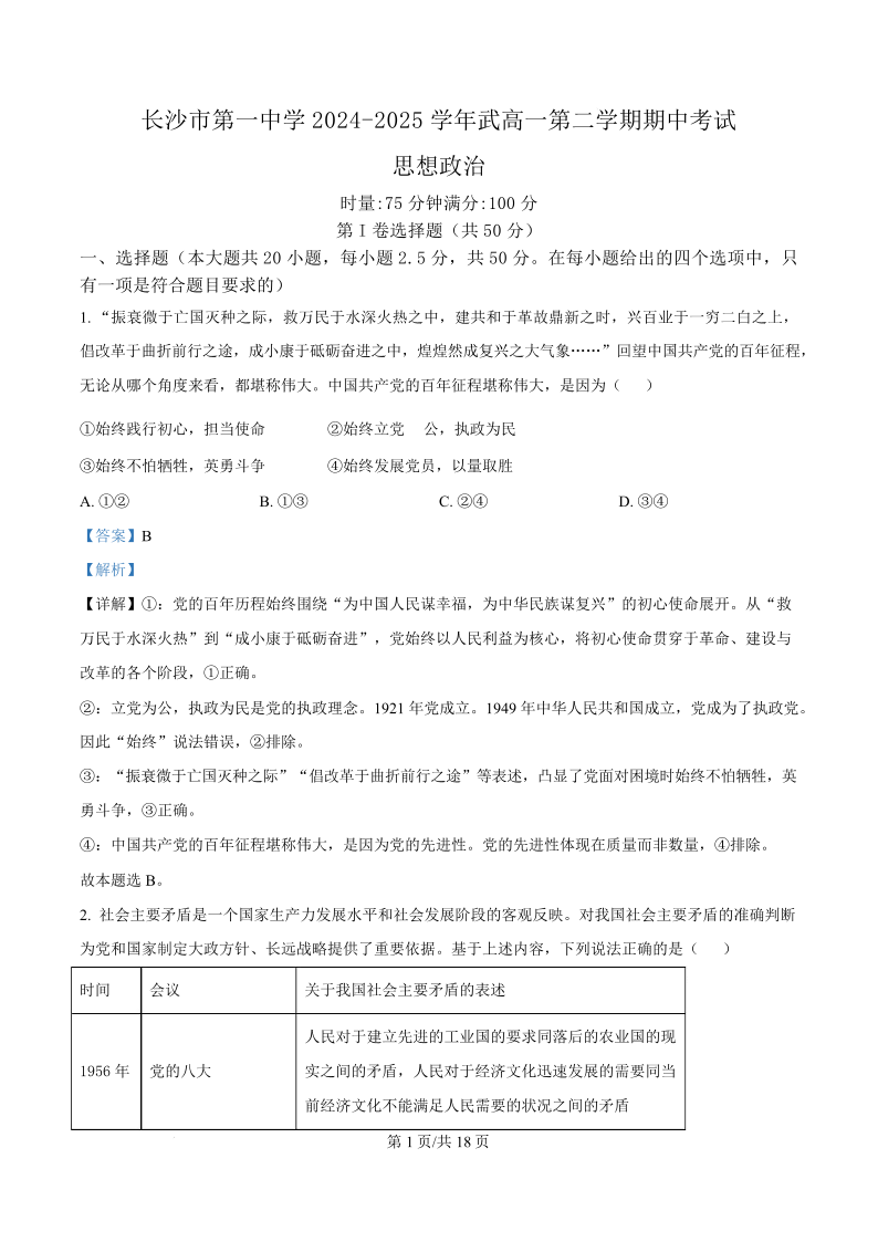 湖南省长沙一中2024-2025学年下学期高一期中考试政治(精品解析版)