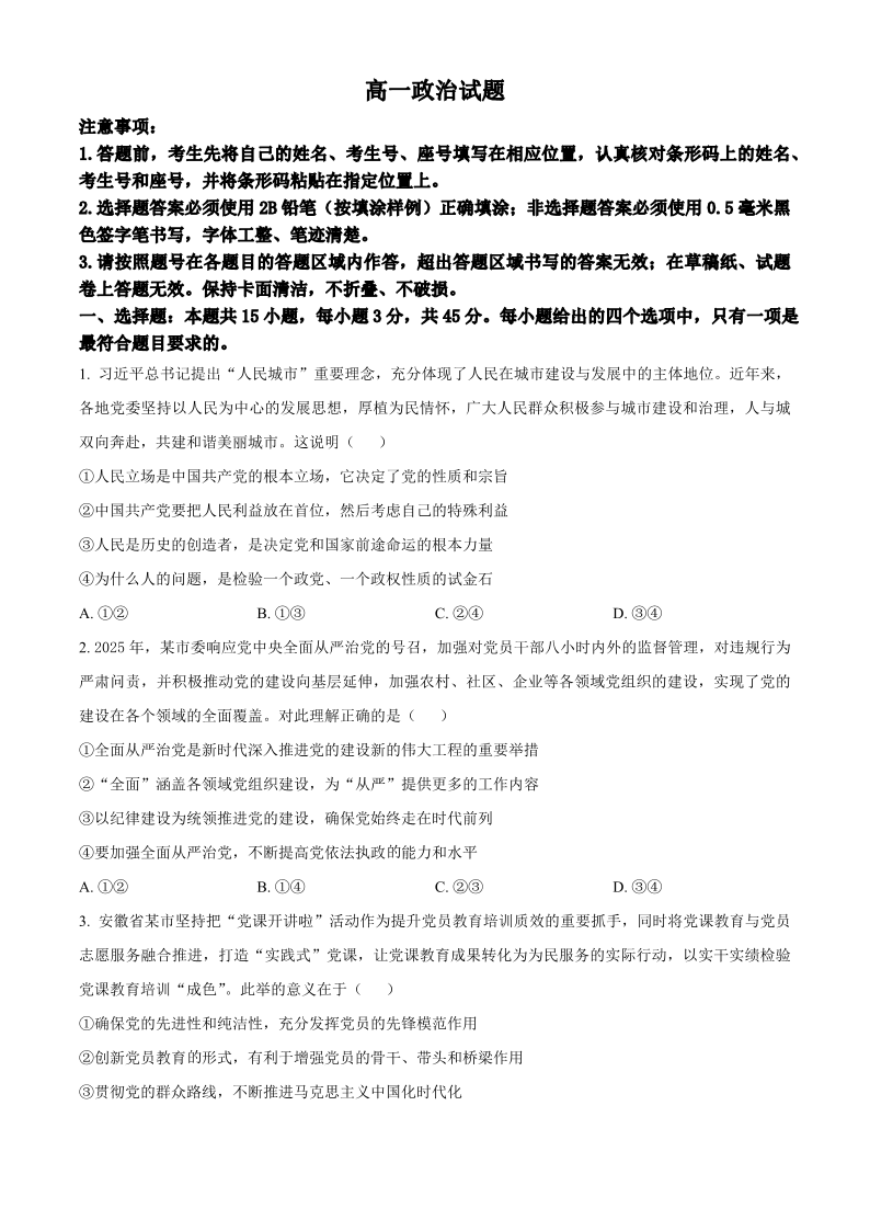 山东省泰安市肥城市2024-2025学年下学期高一期中考试政治+答案