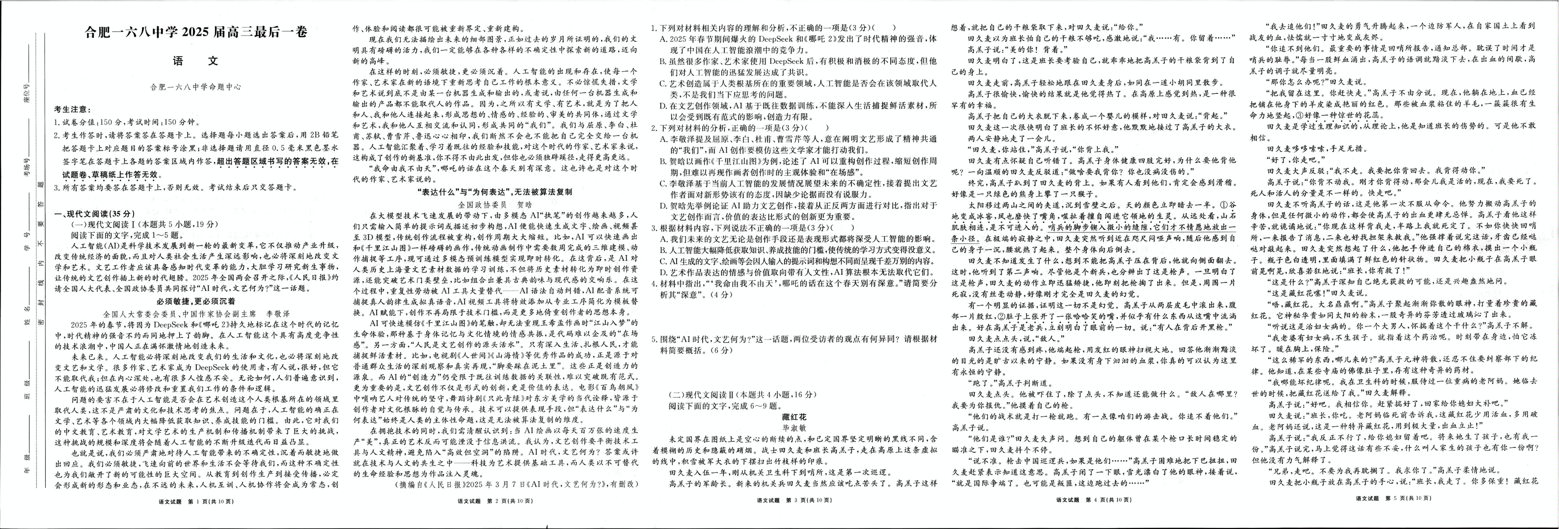安徽省合肥一六八中学2025届高三下学期最后一卷语文+答案