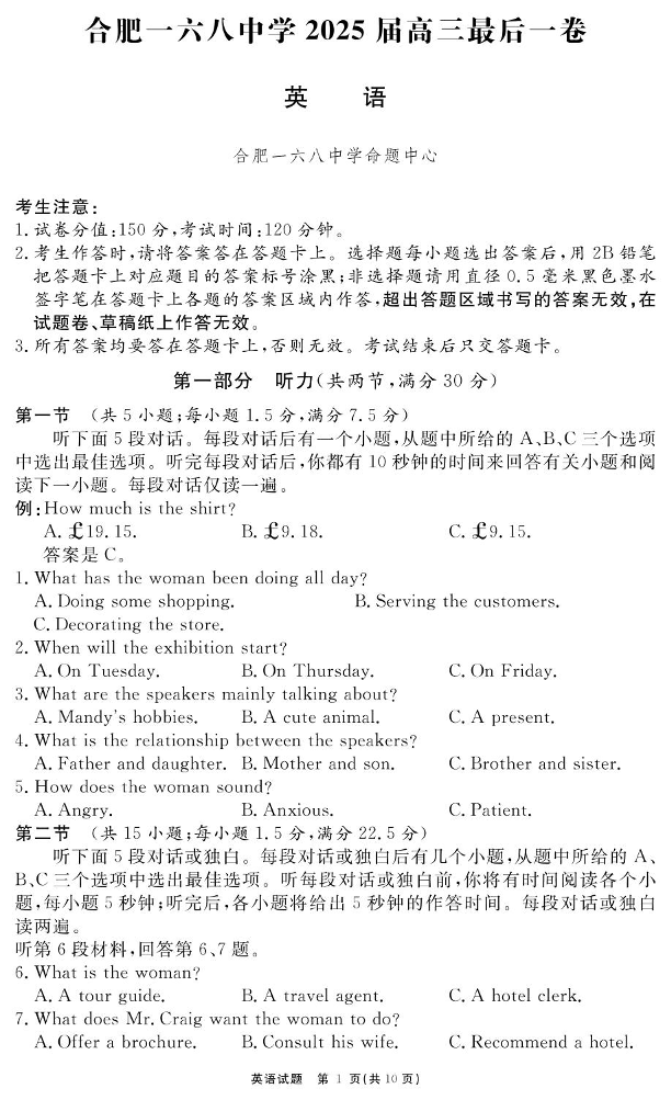安徽省合肥一六八中学2025届高三下学期最后一卷英语