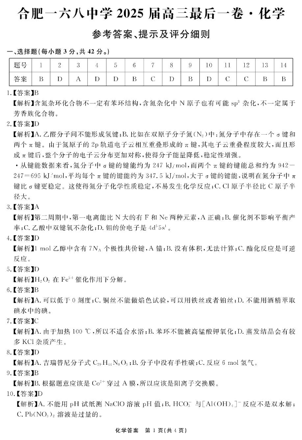 安徽省合肥一六八中学2025届高三下学期最后一卷化学答案