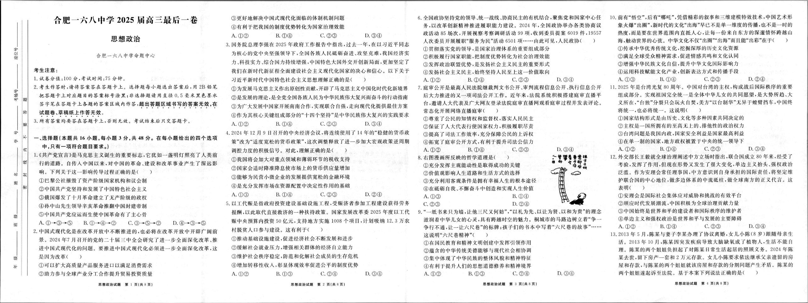 安徽省合肥一六八中学2025届高三下学期最后一卷政治