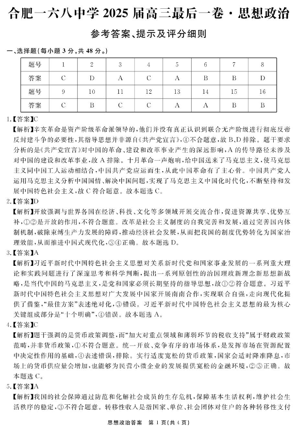 安徽省合肥一六八中学2025届高三下学期最后一卷政治答案