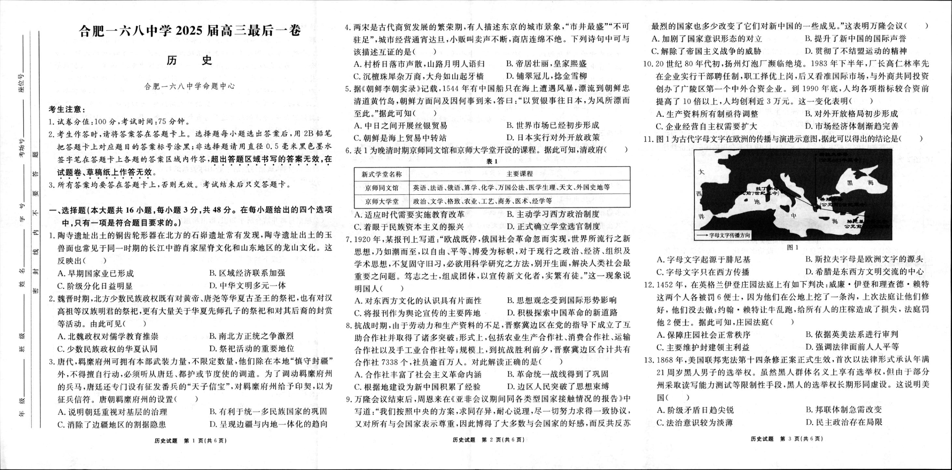安徽省合肥一六八中学2025届高三下学期最后一卷历史