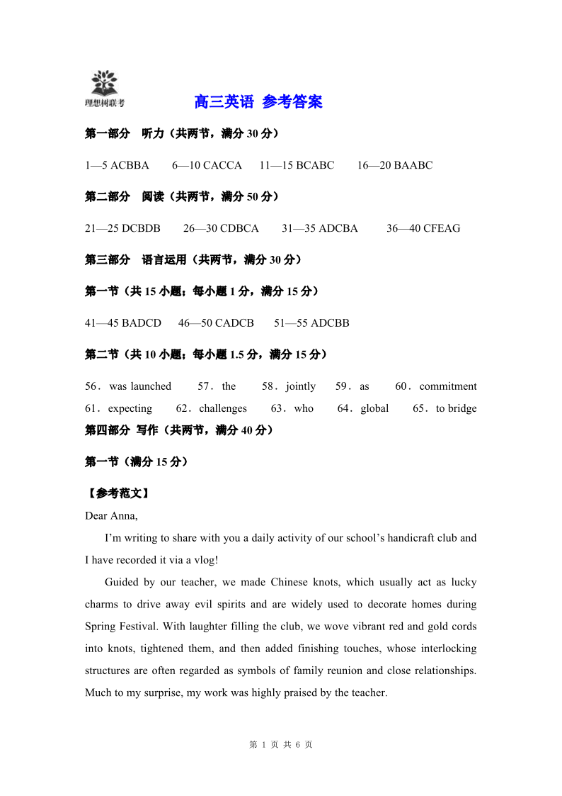 东北三省精准教学联盟2025届下学期5月高三联考英语答案