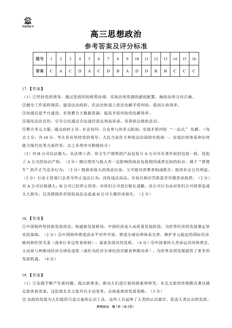 东北三省精准教学联盟2025届下学期5月高三联考政治答案