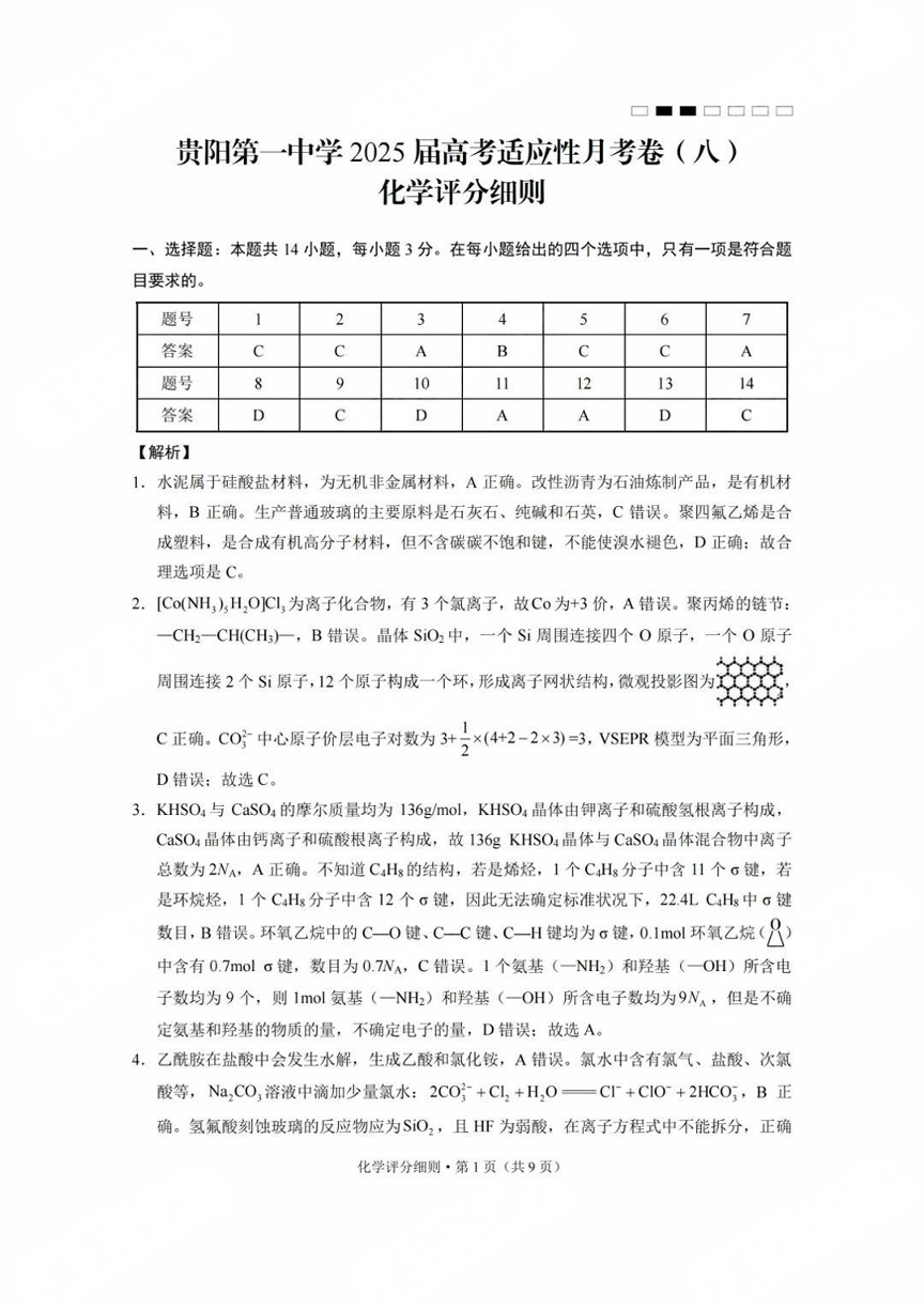 贵州省贵阳第一中学2025届高考适应性月考卷(八)化学答案