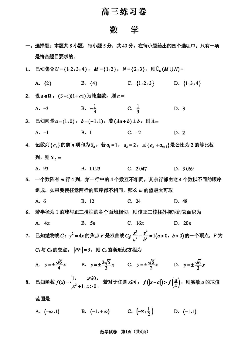 江苏省南通市2025届下学期5月高三四模练习卷数学+答案
