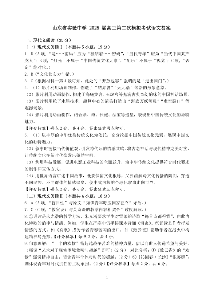 山东省实验中学2025届高三下学期6月二模(押题)语文答案