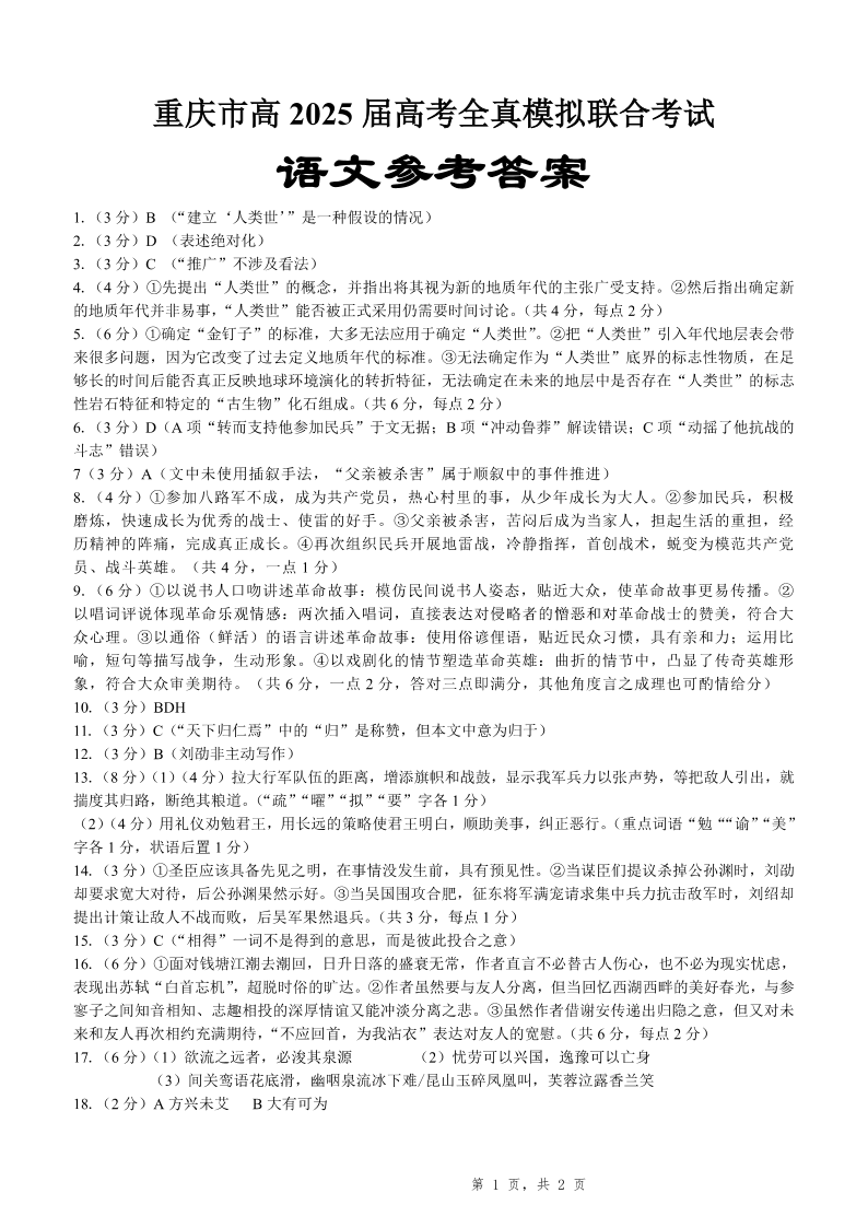 重庆市育才中学高2025届高考全真模拟联合考试语文答案