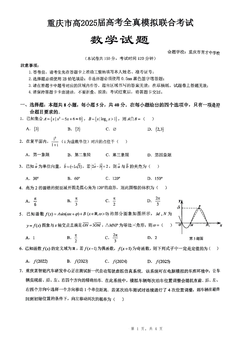 重庆市育才中学高2025届高考全真模拟联合考试数学
