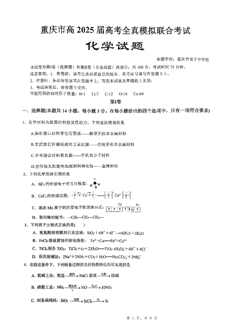 重庆市育才中学高2025届高考全真模拟联合考试化学
