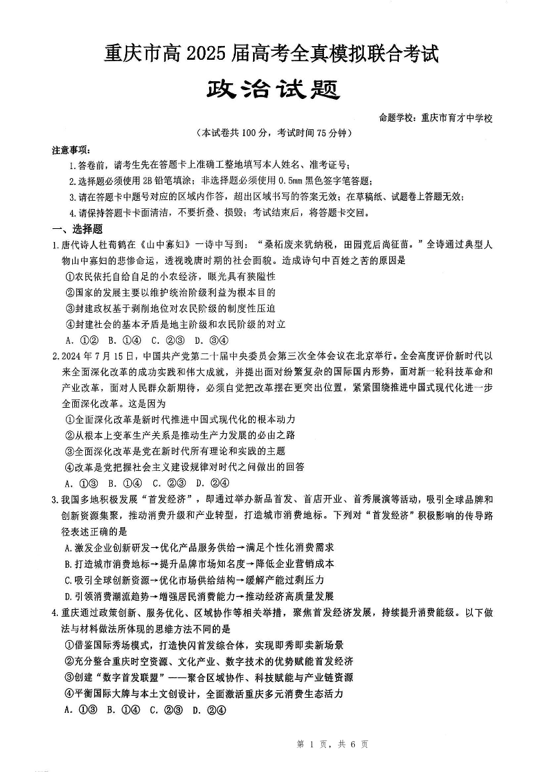 重庆市育才中学高2025届高考全真模拟联合考试政治