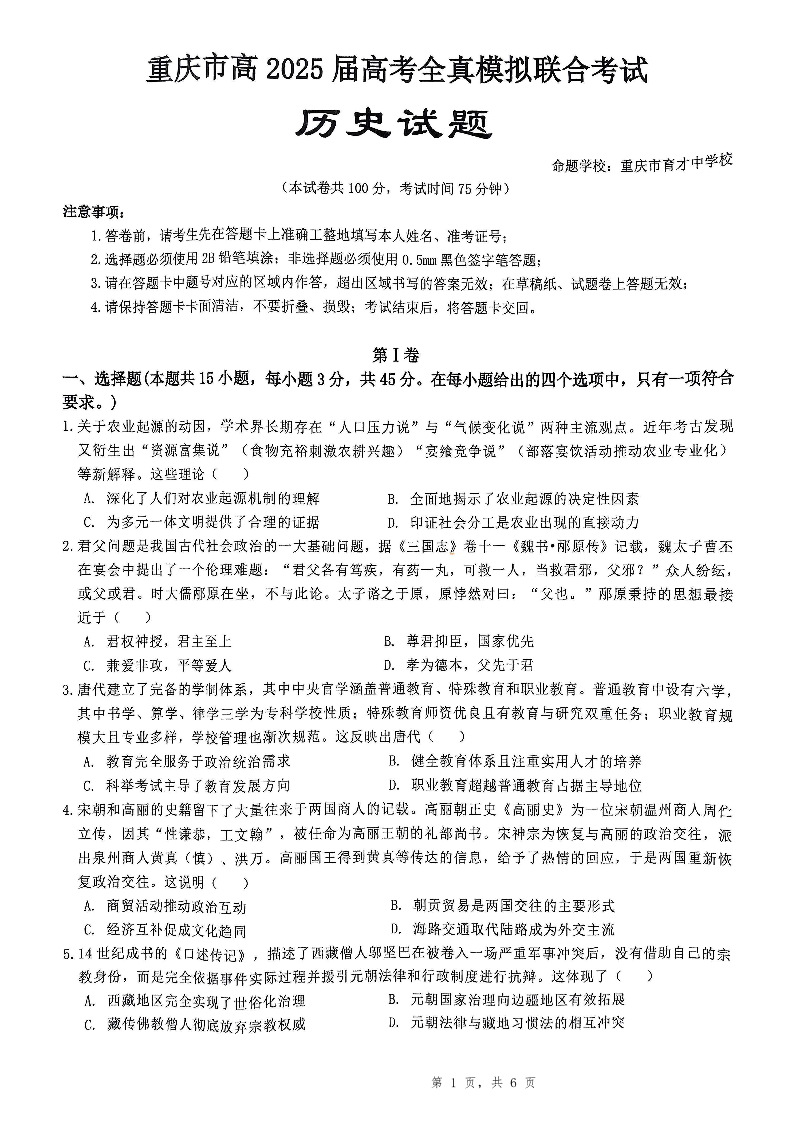 重庆市育才中学高2025届高考全真模拟联合考试历史