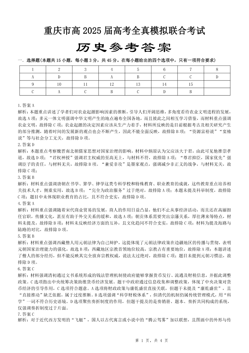 重庆市育才中学高2025届高考全真模拟联合考试历史答案