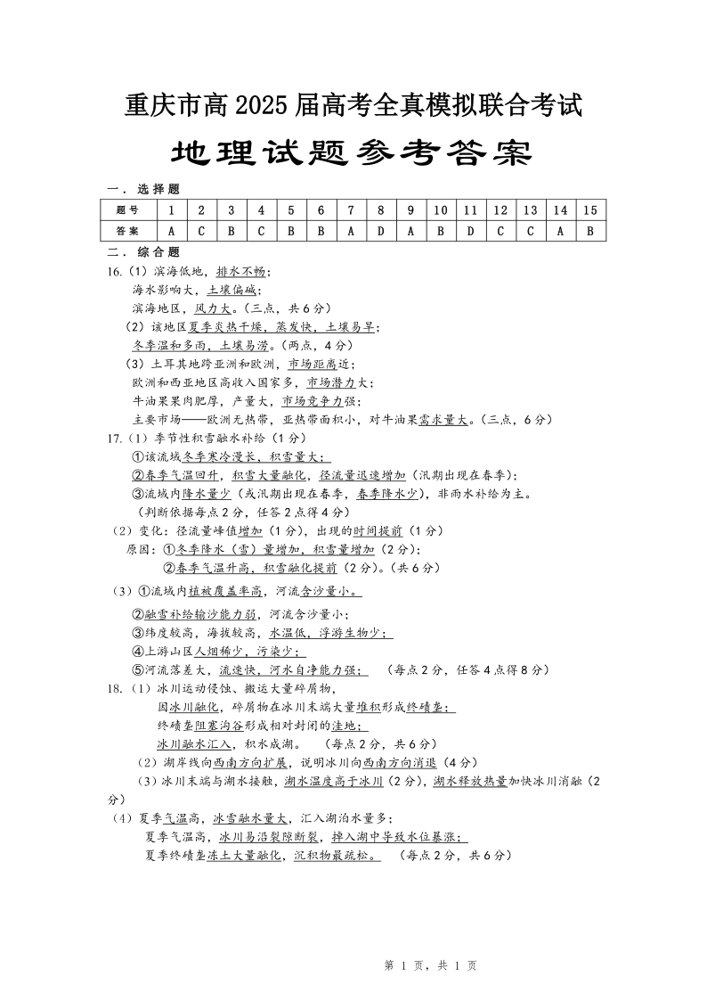 重庆市育才中学高2025届高考全真模拟联合考试地理答案