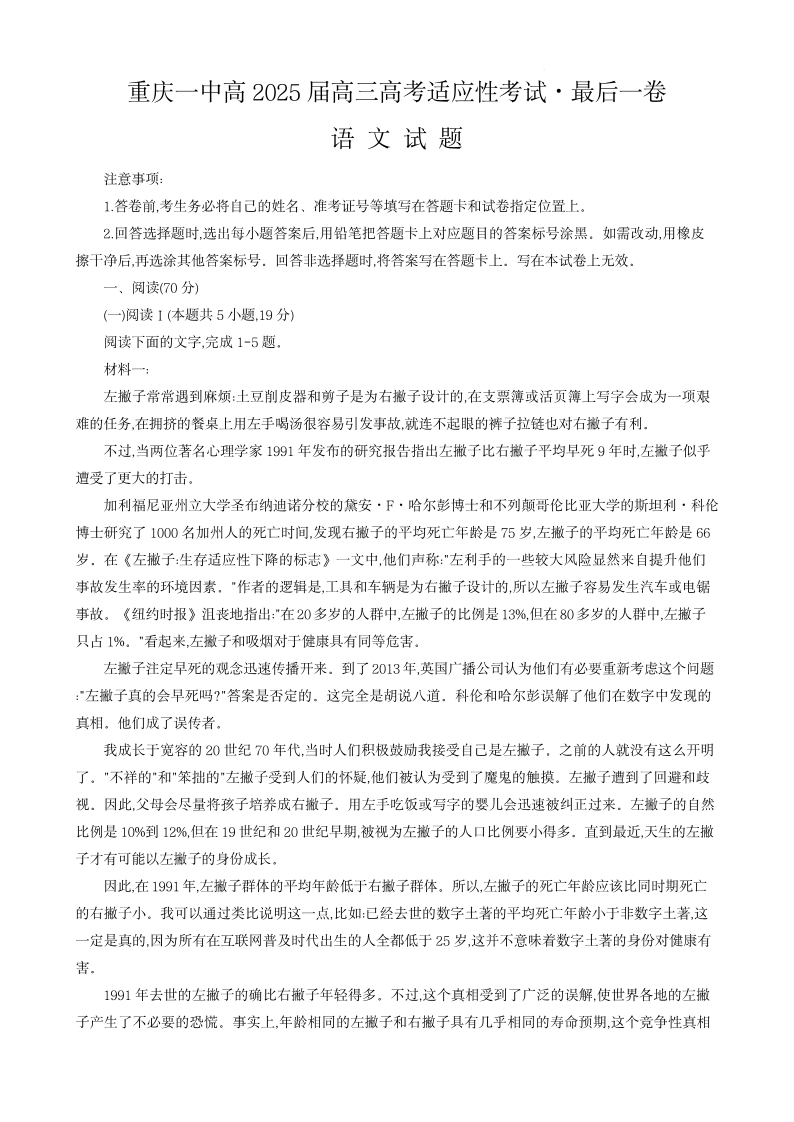 重庆一中 2025 届高考适应性考试最后一卷(全真模拟)语文+答案