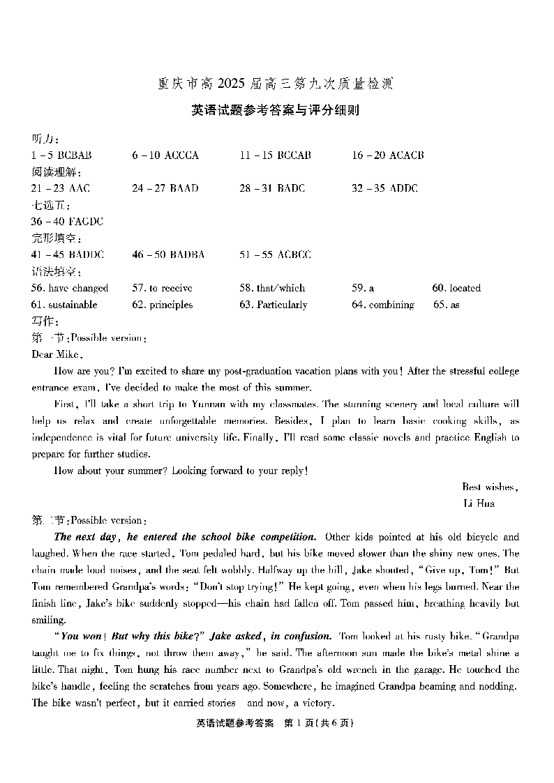 重庆市南开中学2025届高三考前全真模拟英语答案