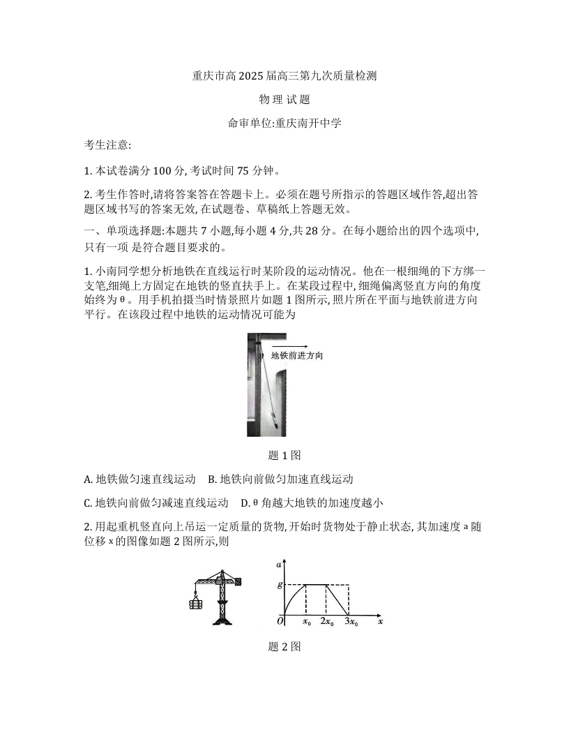 重庆市南开中学2025届高三考前全真模拟物理