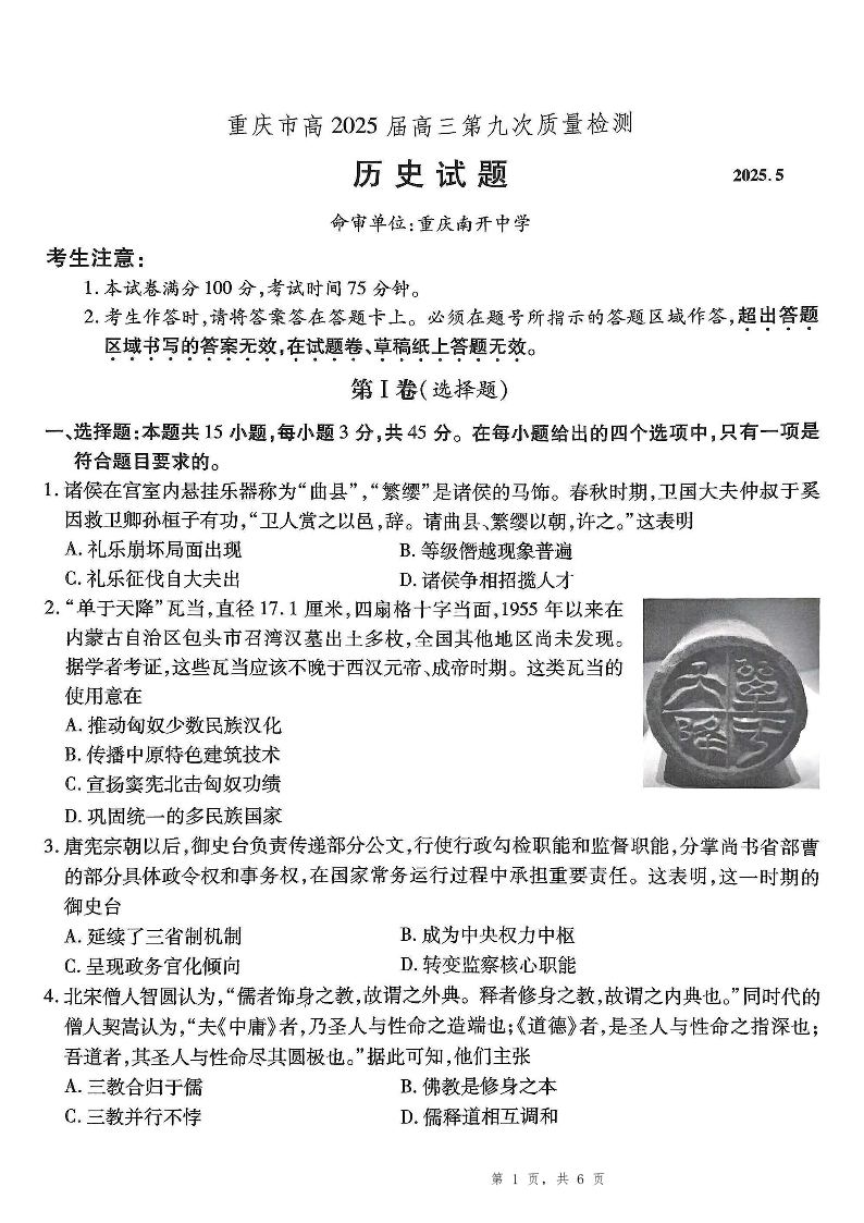 重庆市南开中学2025届高三考前全真模拟历史答案