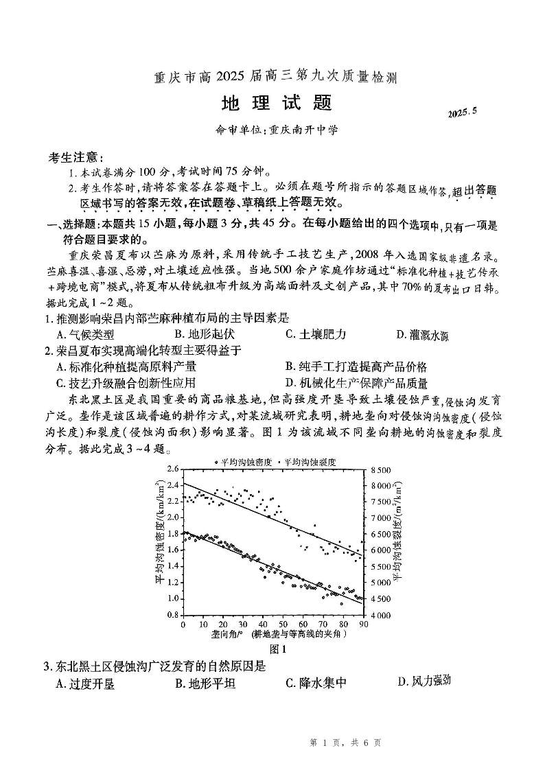 重庆市南开中学2025届高三考前全真模拟地理