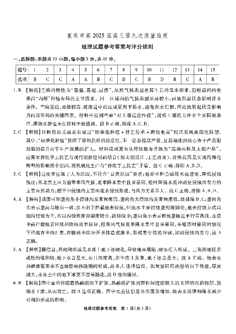 重庆市南开中学2025届高三考前全真模拟地理答案