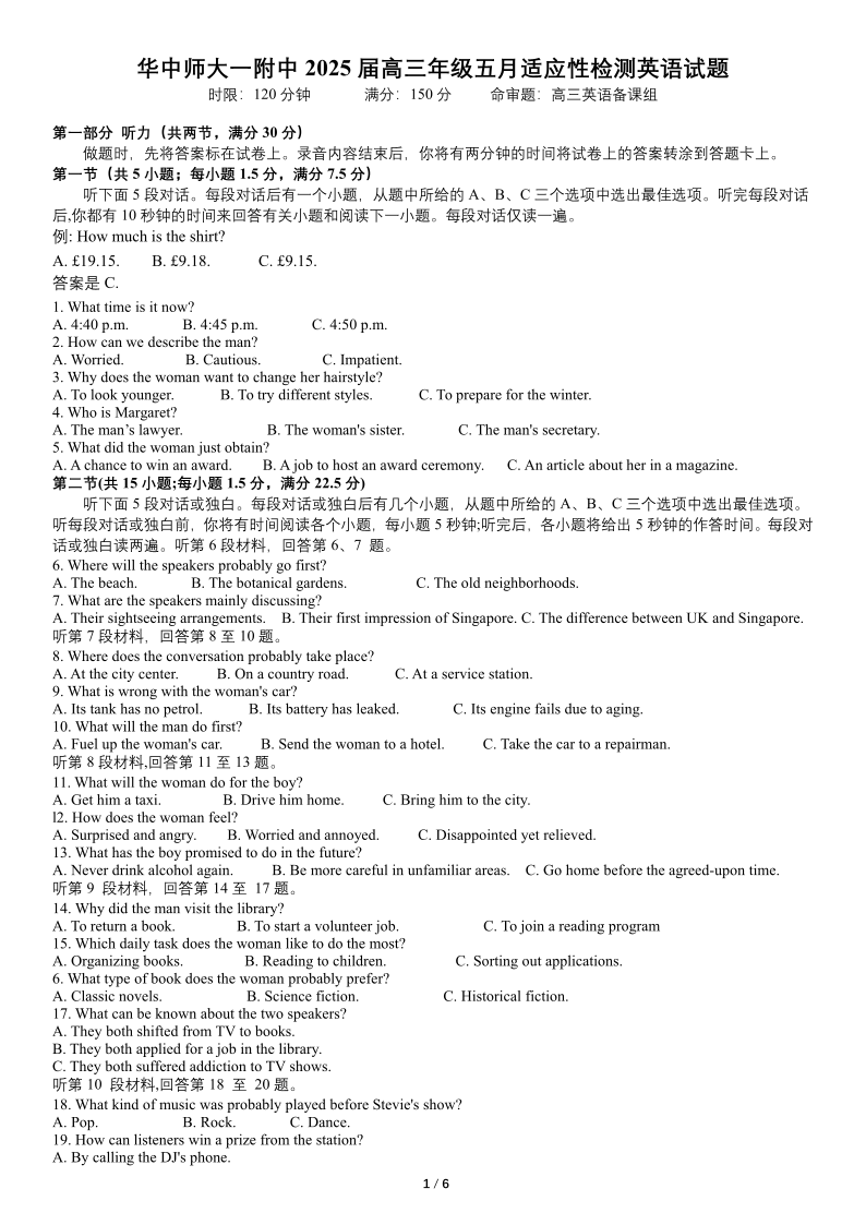 湖北省华范大一附中2025届下学期五月高三适应性检测英语