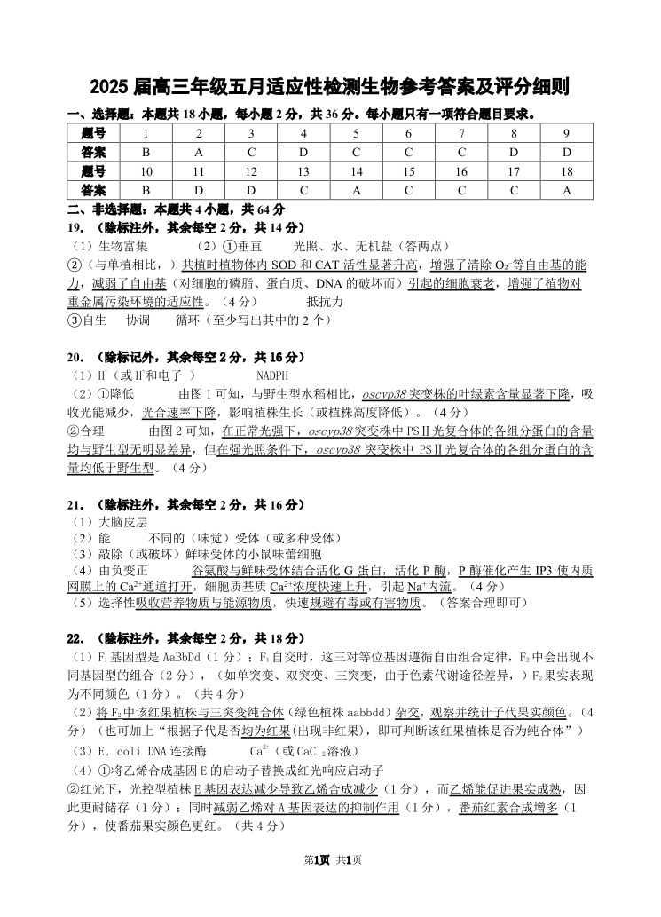 湖北省华范大一附中2025届下学期五月高三适应性检测生物答案