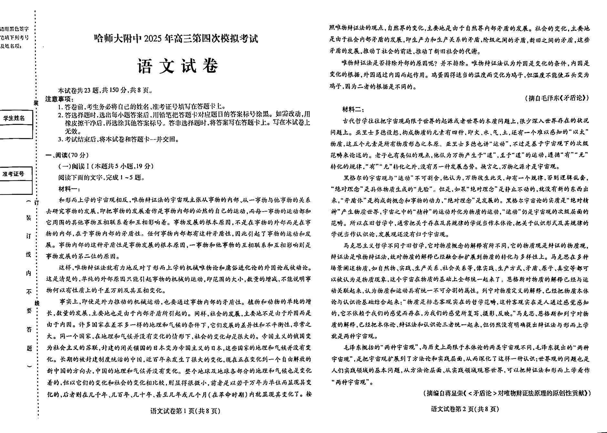 黑龙江省哈师大附中2025届高三第四次模拟考试语文
