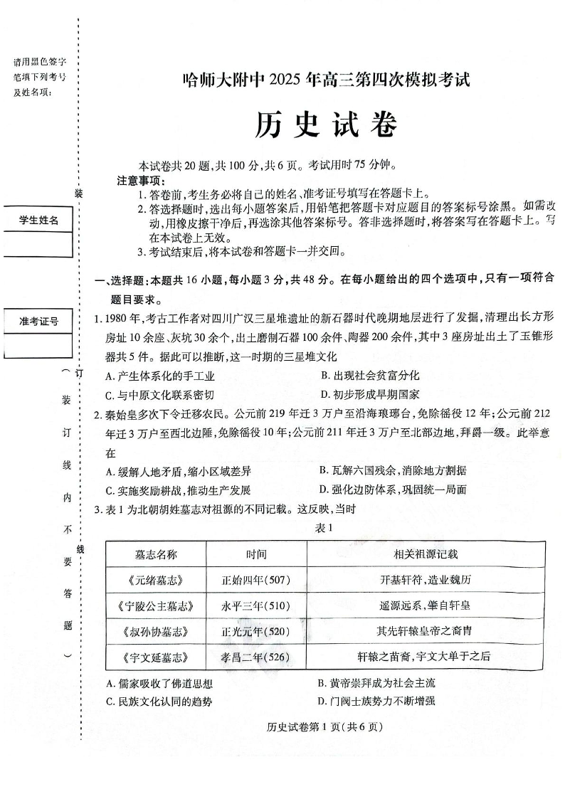 黑龙江省哈师大附中2025届高三第四次模拟考试历史
