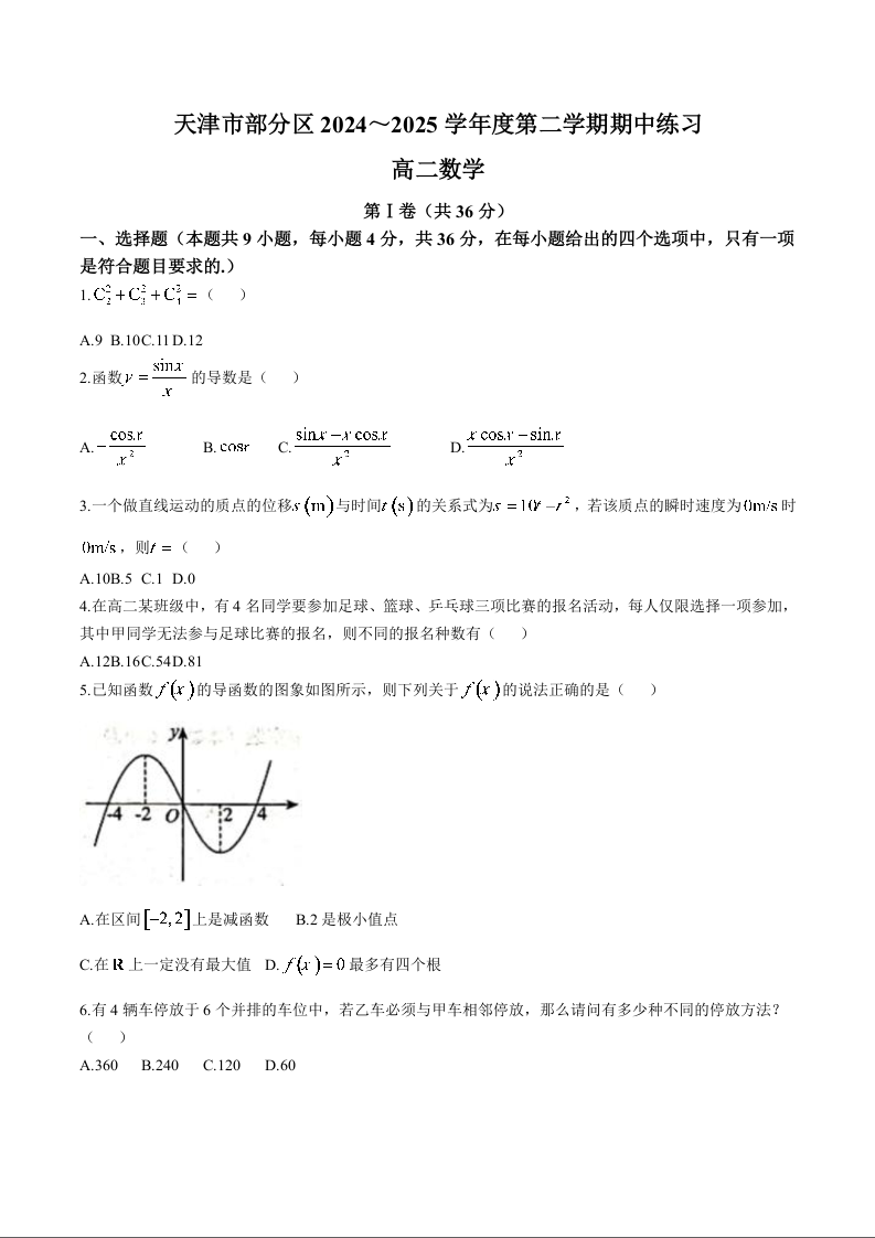 天津市部分区2024-2025学年下学期高二期中练习数学+答案