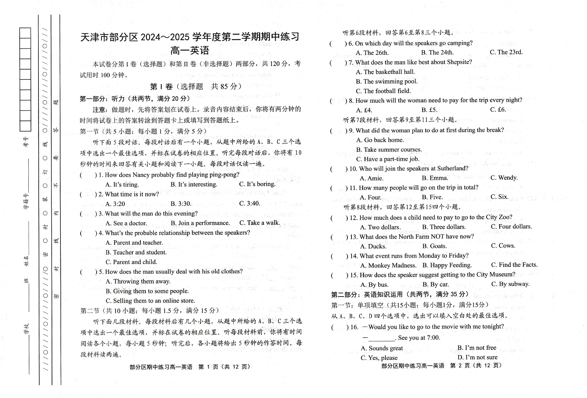 天津市部分区2024-2025学年下学期高一期中练习英语+答案
