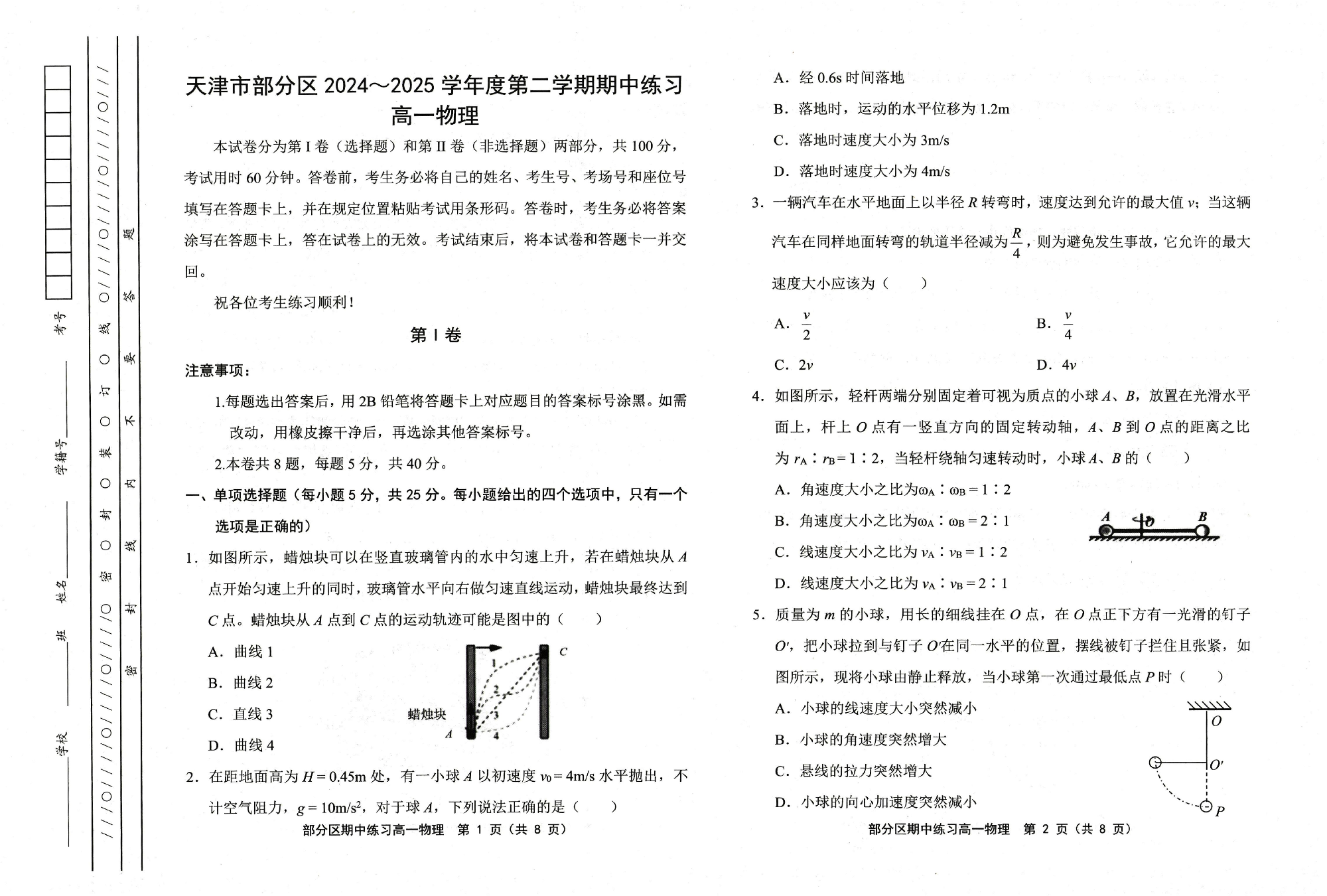 天津市部分区2024-2025学年下学期高一期中练习物理+答案