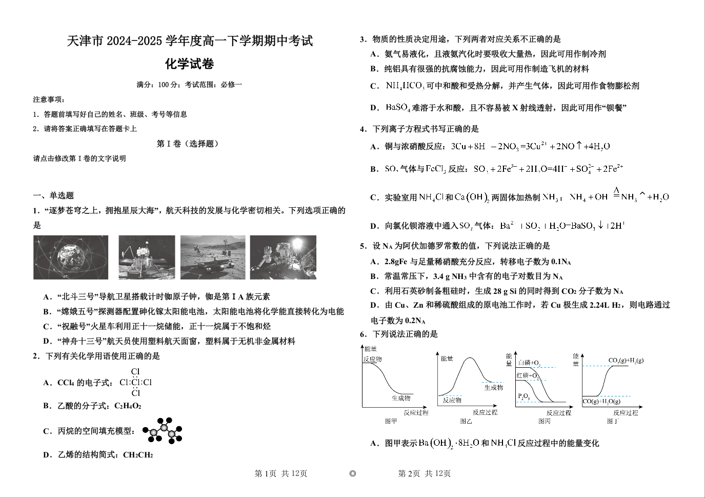 天津市部分区2024-2025学年下学期高一期中练习化学+答案