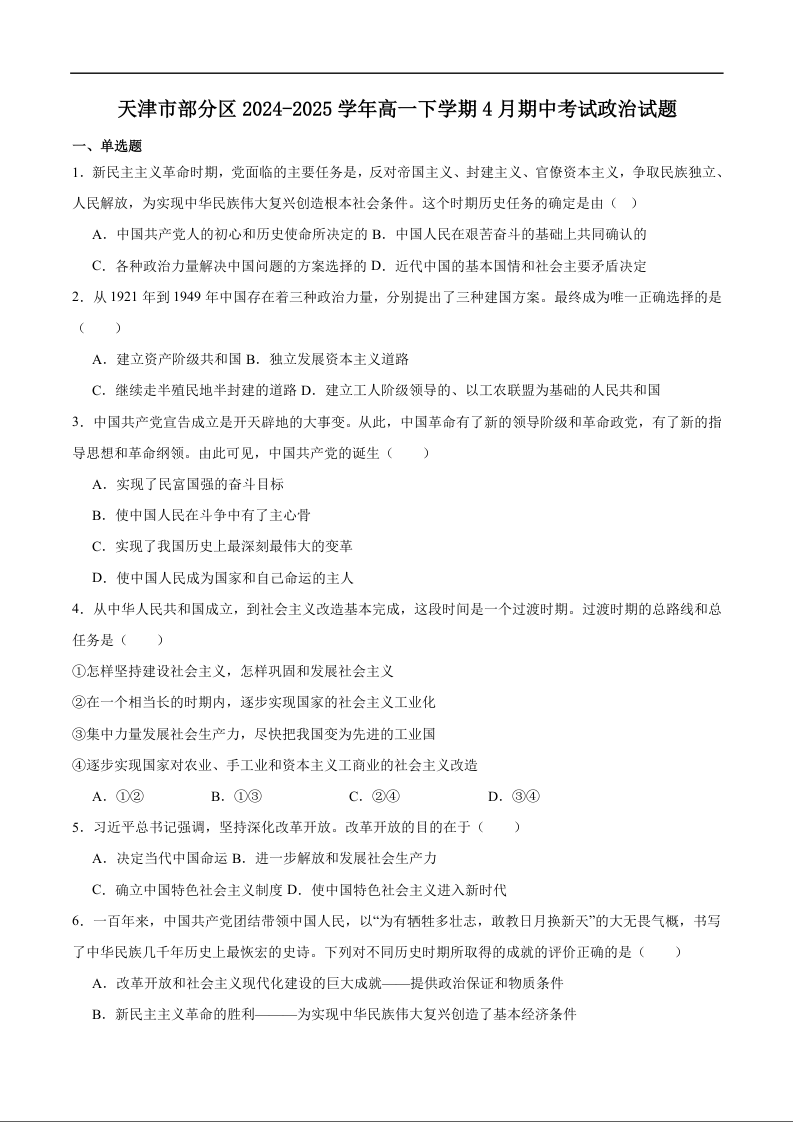 天津市部分区2024-2025学年下学期高一期中练习政治+答案