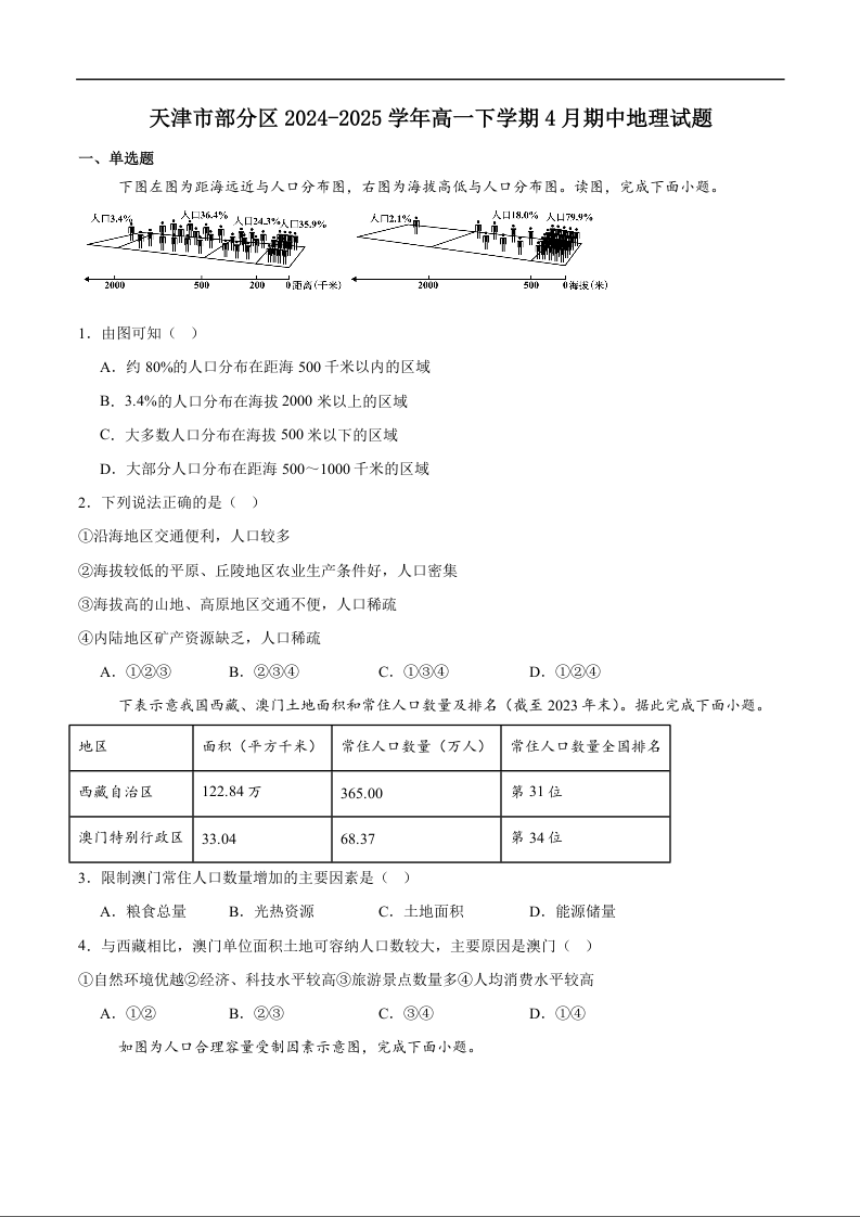 天津市部分区2024-2025学年下学期高一期中练习地理+答案